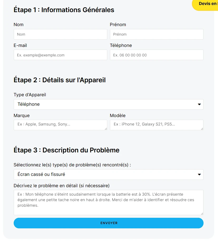 Le site intègre un module de devis en ligne permettant aux clients de décrire leur problème technique et d’obtenir une estimation préliminaire. Cette fonctionnalité simplifie le premier contact client tout en préqualifiant les demandes pour optimiser l’organisation de l’atelier.