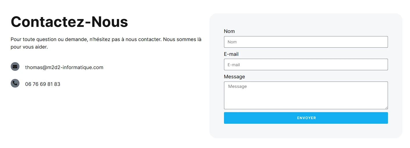 En collaboration avec l’identité visuelle de l’entreprise, nous avons conçu un site web entièrement personnalisé reflétant les valeurs techniques et le professionnalisme de M2D2 Informatique. Le design allie modernité technologique et accessibilité, avec une navigation intuitive adaptée aux besoins d’un atelier de réparation électronique.