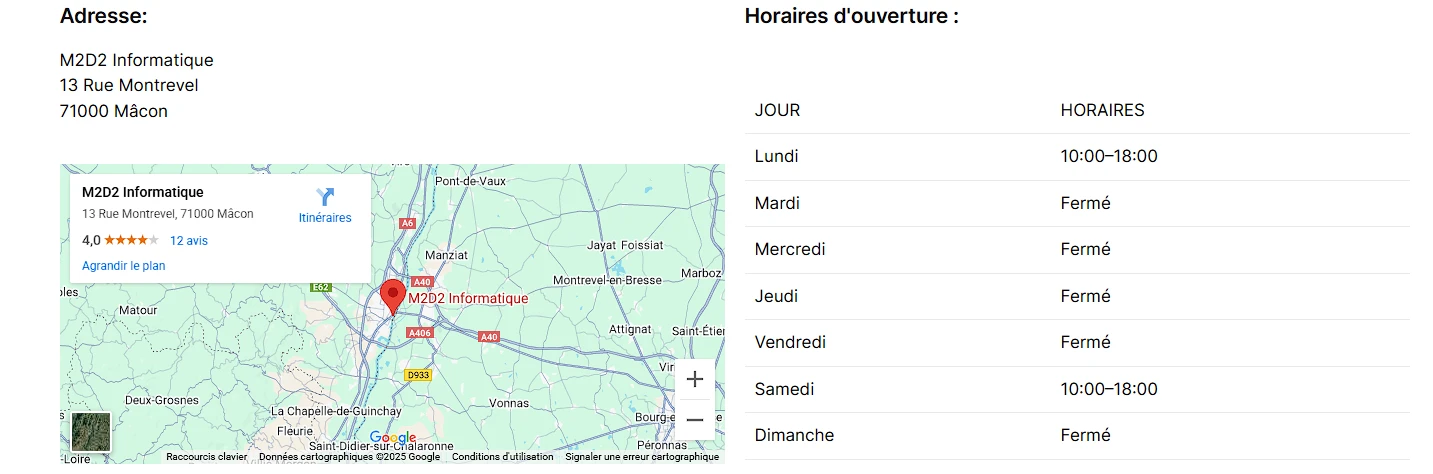M2D2 Informatique, entreprise fondée par Thomas à Mâcon, s’est spécialisée dans la réparation d’équipements électroniques : smartphones, tablettes, ordinateurs Mac/Windows et consoles de jeux. Face à une concurrence croissante dans le secteur de la réparation électronique, l’entreprise souhaitait moderniser sa communication digitale pour attirer une clientèle locale et régionale recherchant expertise technique et service de qualité.