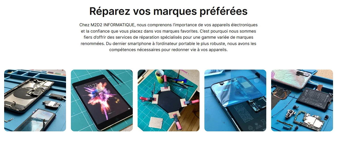 La présentation des marques réparées (Apple, Samsung, Huawei, Microsoft, Sony) renforce la polyvalence technique. Cette galerie visuelle rassure les clients sur la capacité de l’atelier à traiter leur marque spécifique tout en valorisant l’expertise multi-supports.