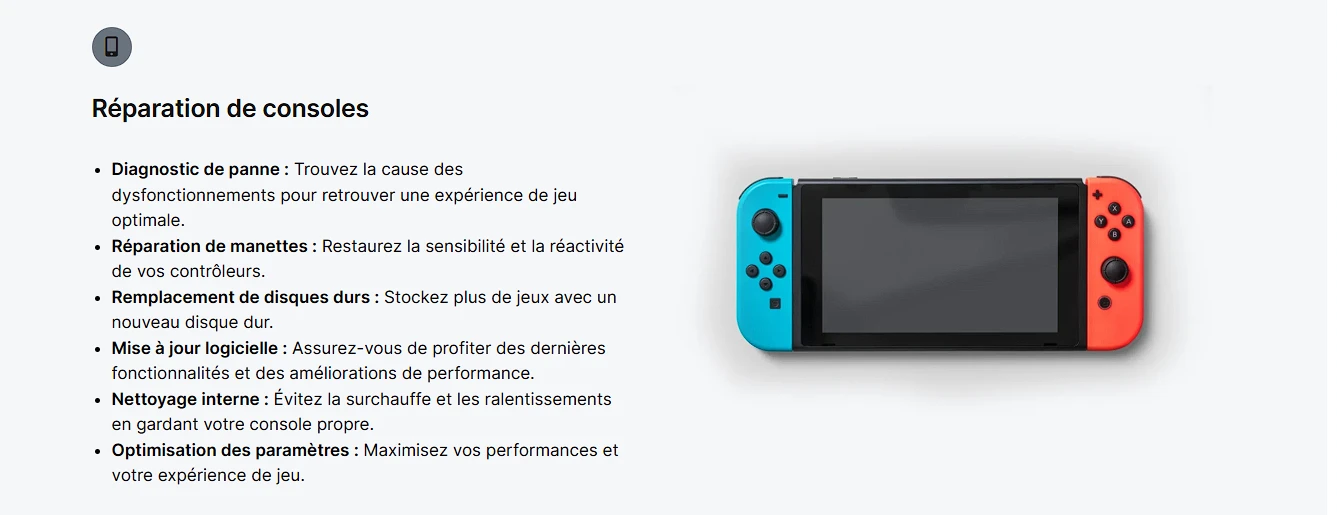 Chaque catégorie de réparation dispose d’une section dédiée avec services détaillés : réparation smartphones (écran, batterie, connecteur), tablettes (diagnostic, écran, mise à jour), ordinateurs Mac/Windows (hardware, logiciel, nettoyage) et consoles (manettes, disque dur, optimisation). Cette structuration facilite la compréhension de l’offre technique complète.