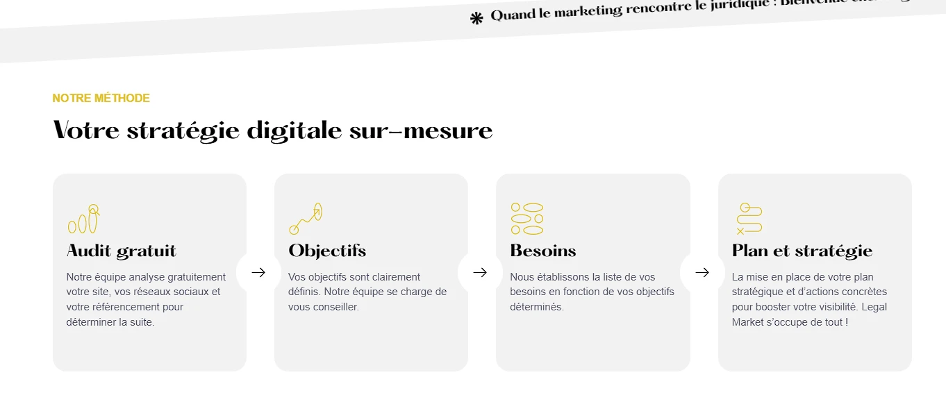 La structure du site valorise leur méthodologie en quatre étapes : audit gratuit, définition d’objectifs, analyse des besoins et mise en place de la stratégie. Cette présentation méthodique rassure les visiteurs sur l’approche professionnelle et structurée de Legal Market. Le module de prise de rendez-vous facilite les premiers contacts tout en qualifiant les prospects.
