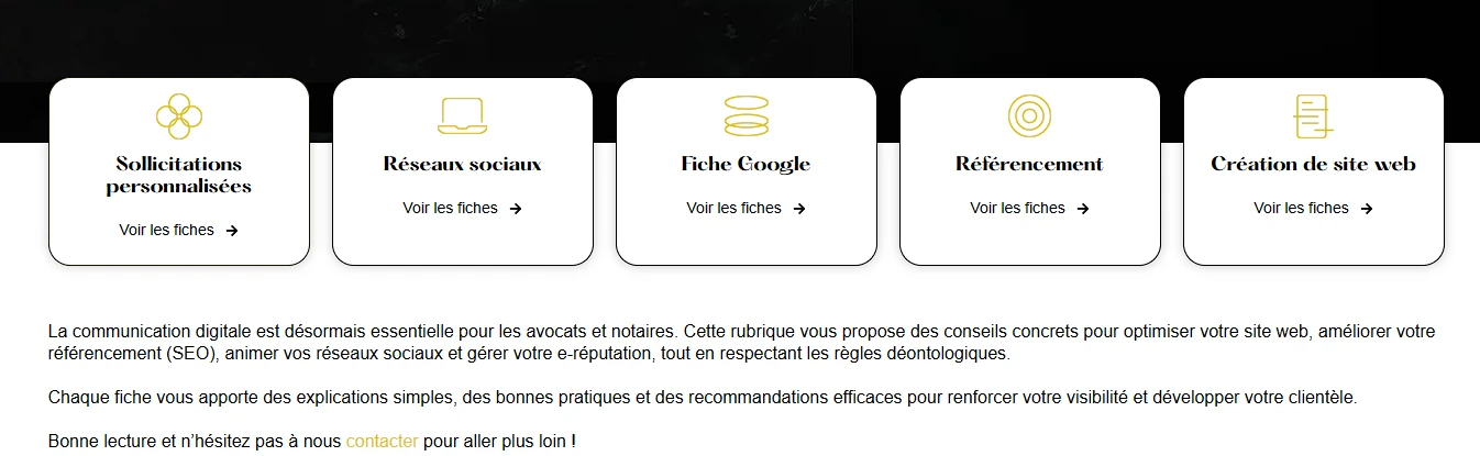 Leur site internet, que nous avons développé, illustre parfaitement cette philosophie. La segmentation par profession (avocats, notaires, autres) facilite l’identification des visiteurs avec leurs besoins spécifiques. Le design professionnel inspire confiance tout en restant accessible, reflétant l’approche équilibrée de l’agence.