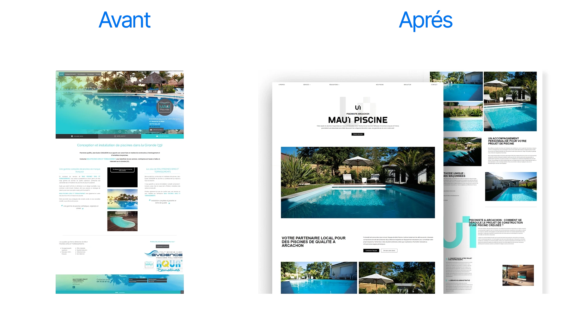 Maui Piscine, entreprise spécialisée dans la création de piscines maçonnées haut de gamme sur le Bassin d’Arcachon, faisait face à un défi majeur : leur présence digitale ne reflétait absolument pas leur expertise artisanale ni leur positionnement premium. Leur ancien site vitrine était non seulement inefficace en termes de génération de leads, mais il desservait également leur image de marque auprès d’une clientèle exigeante recherchant des piscines sur-mesure de qualité exceptionnelle.